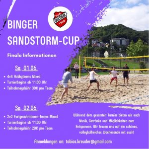 Wir vom T.u.S. Gaulsheim veranstalten dieses Jahr vom 01.-02.06 das Beachvolleyball-Turnier ,,Binger Sandstorm Cup“ im Park am Mäuseturm in Bingen! Samstags gibt’s ein Hobbyturnier im 4v4 Modus, sonntags können Fortgeschrittene/Aktive ihr Können im 2v2 Turnier zeigen. Beim gesamten Turnier wird es Musik + Getränke geben, Teilnahmegebühr beträgt beim 4v4 30€ und beim 2v2 20€ pro Team. Wir freuen uns über viele Teams umso mehr auf ein schönes Turnier! Anmeldungen an tobias.kreuder@gmail.com.